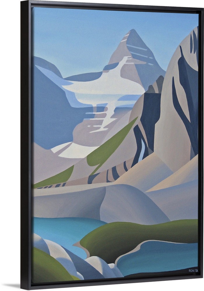 <p>Contemporary painting of mountain scape, with a lake at the base.</p>