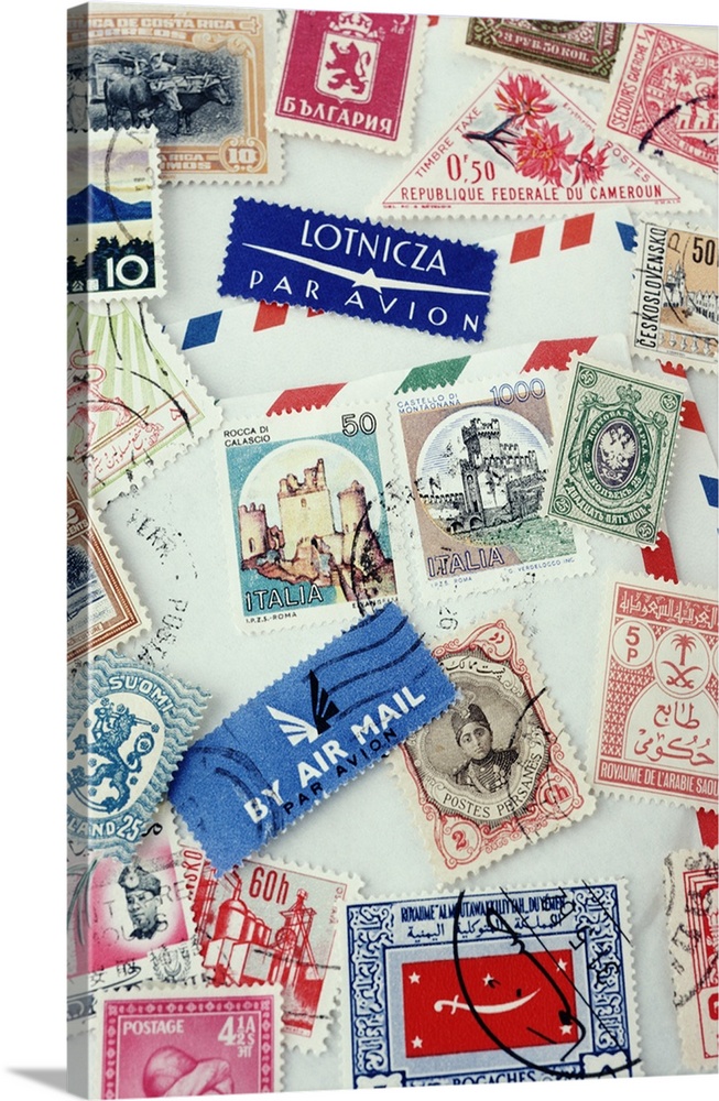 Assorted stamps from various countries, overhead view