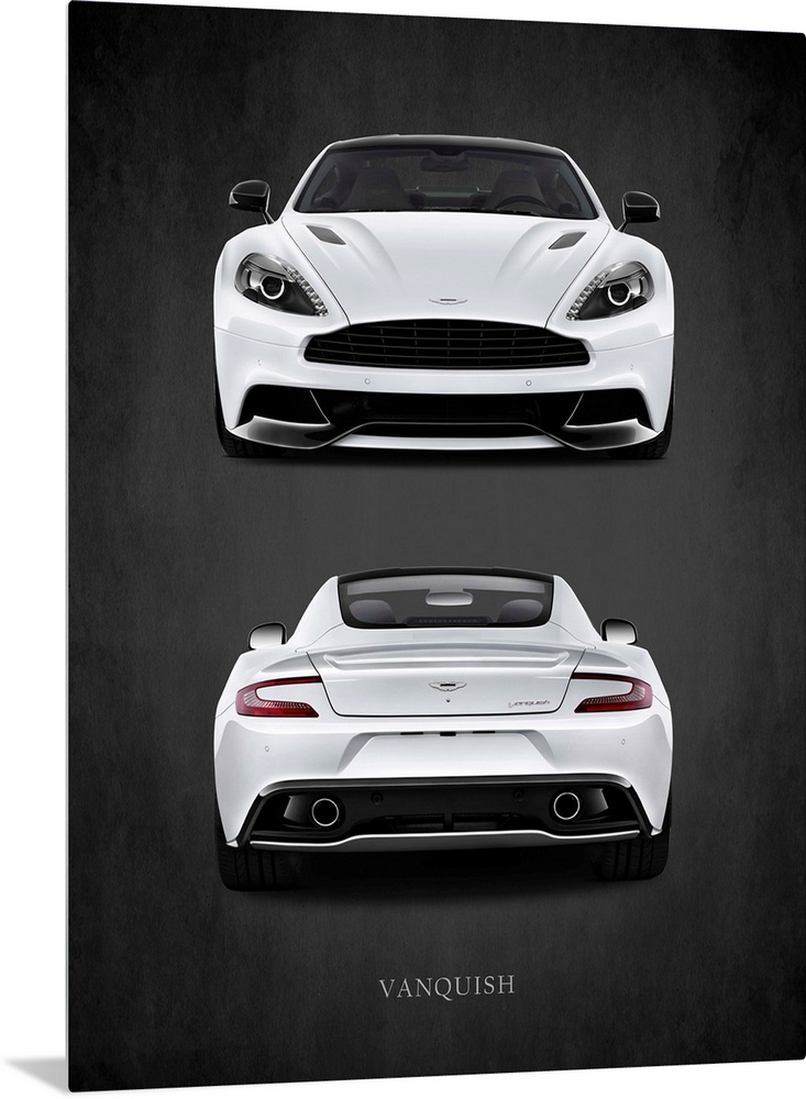 <p>Photograph of a the front and back of a white Aston Martin Vanquish printed on a black background with a dark vignette.</p>