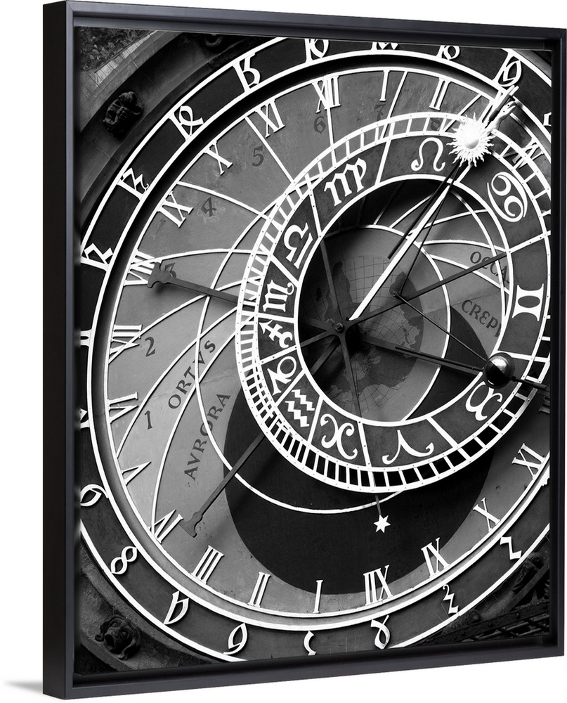 <p>zodiac, clock, architectural, black and white photograph</p>