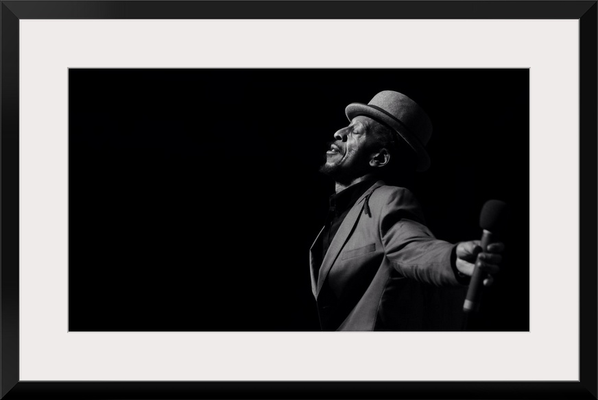 <p>A black and white portrait of a musician giving a performance.</p>