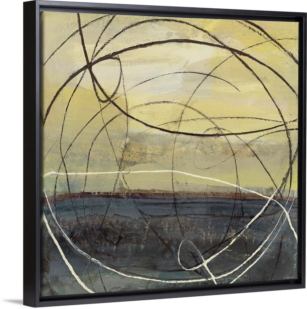 <p>Abstract artwork in black and yellow with circular lines.</p>
