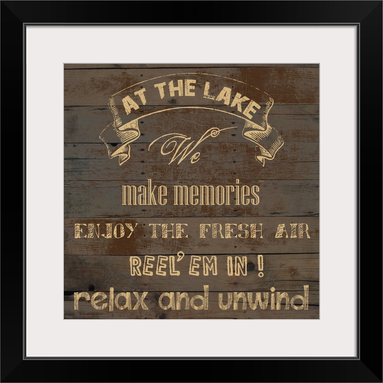 <p>"At the Lake We Make Memories Enjoy the Fresh Air Reel 'em in! Relax and Unwind" on an aged wood background.</p>