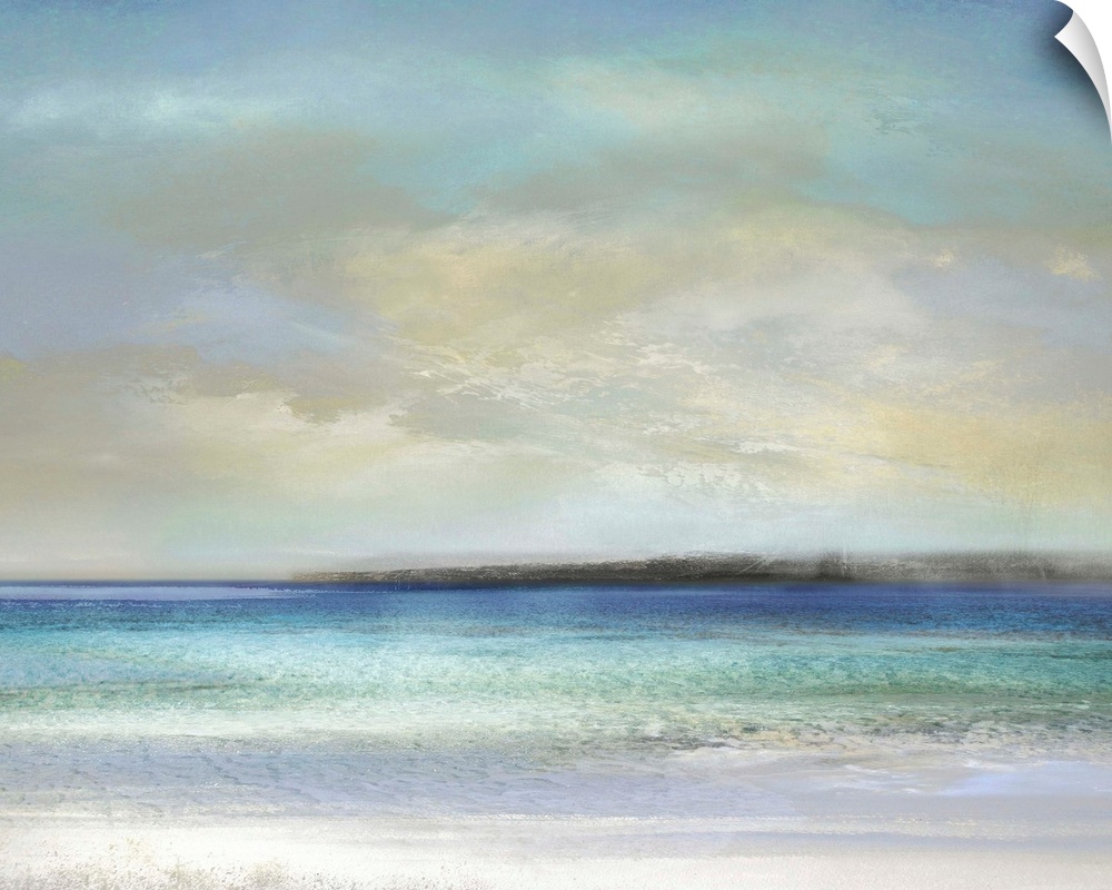 <p>This abstract landscape features nautical colors peppered with beige tones to illustrate a shore.</p>