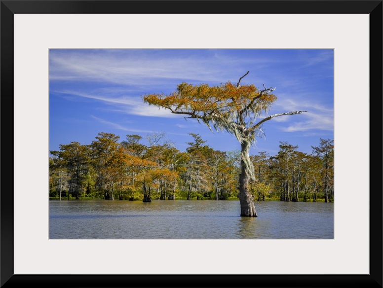 <p>A Spanish moss-draped cypress tree stands alone in the Atchafalaya Basin's Grand Lake. The tree, which has begun turning autumn gold, is an iconic symbol of South Louisiana's extensive swamps.</p>