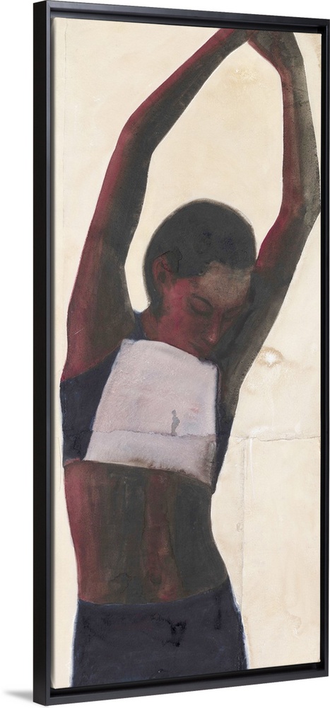 <p>Contemporary watercolor painting of an athlete stretching her arms up into the air.</p>