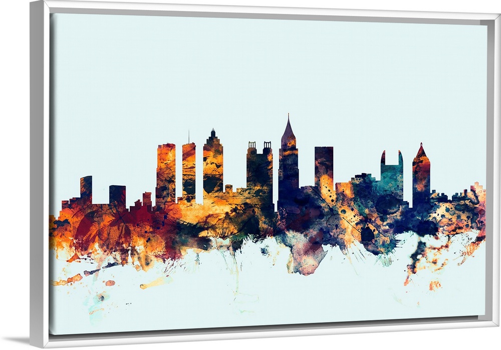 <p>Dark watercolor silhouette of the Atlanta city skyline against a light blue background.</p>