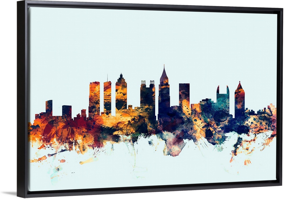 <p>Dark watercolor silhouette of the Atlanta city skyline against a light blue background.</p>