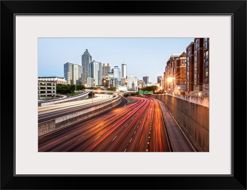 <p>Light trails on the street from passing vehicles leading towards the city skyline of Atlanta, Georgia, at twilight.</p>