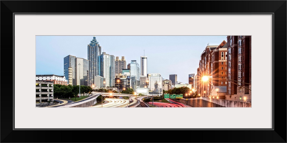 <p>Light trails on the street from passing vehicles leading towards the city skyline of Atlanta, Georgia, at twilight.</p>