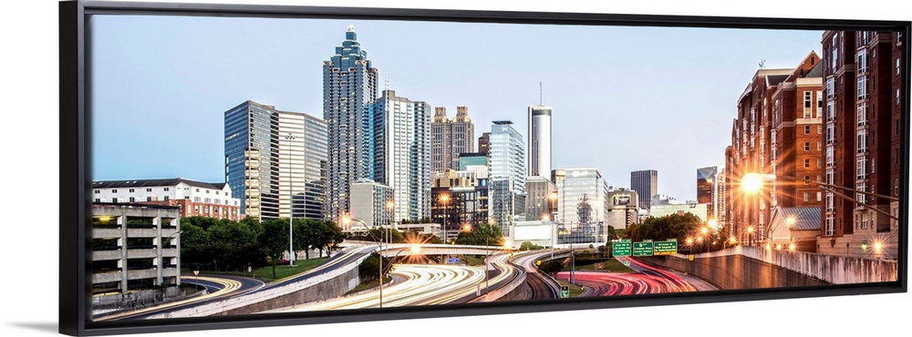 <p>Light trails on the street from passing vehicles leading towards the city skyline of Atlanta, Georgia, at twilight.</p>