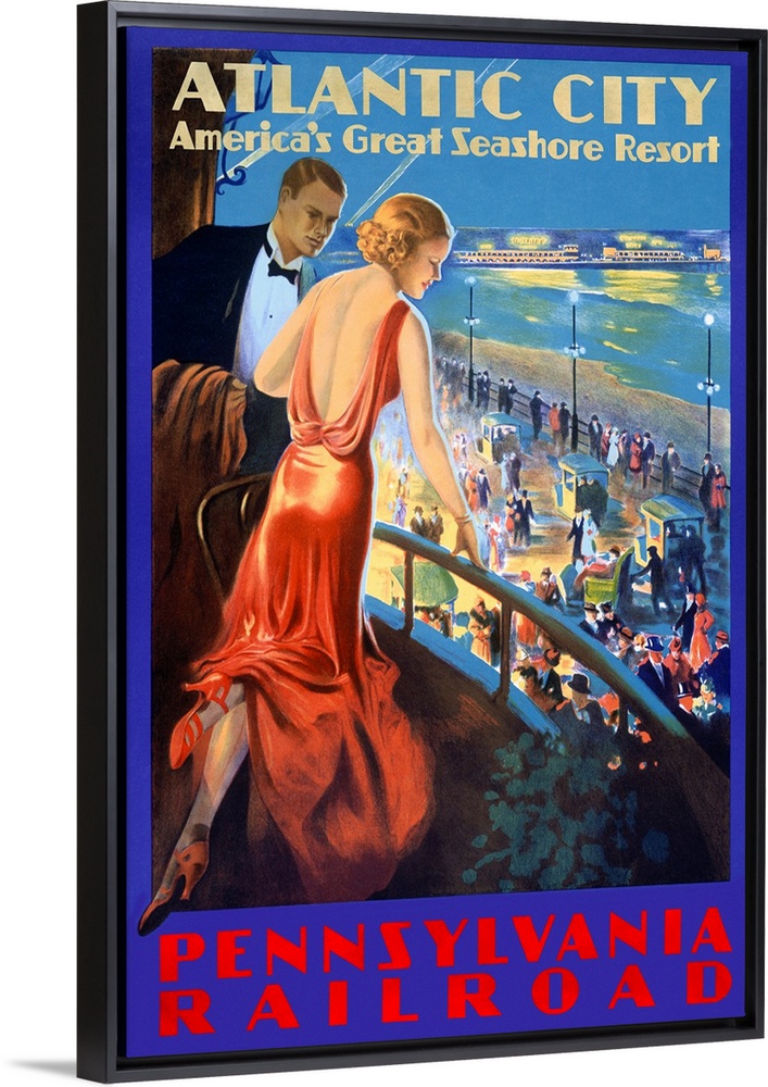 <p>A dazzling Art Deco poster inviting upscale travelers to Atlantic City via the Pennsylvania Railroad. The image captures a glamorous evening scene, with a couple in formal attire gazing over a lively boardwalk teeming with nightlife and neon. The woman's red silk gown draws focus, embodying the era's opulence. The Pennsylvania Railroad's name anchors the image in bold geometric type. The poster exudes the aspirational tone typical of interwar American rail advertising, selling not just a destination-but a lifestyle.</p>