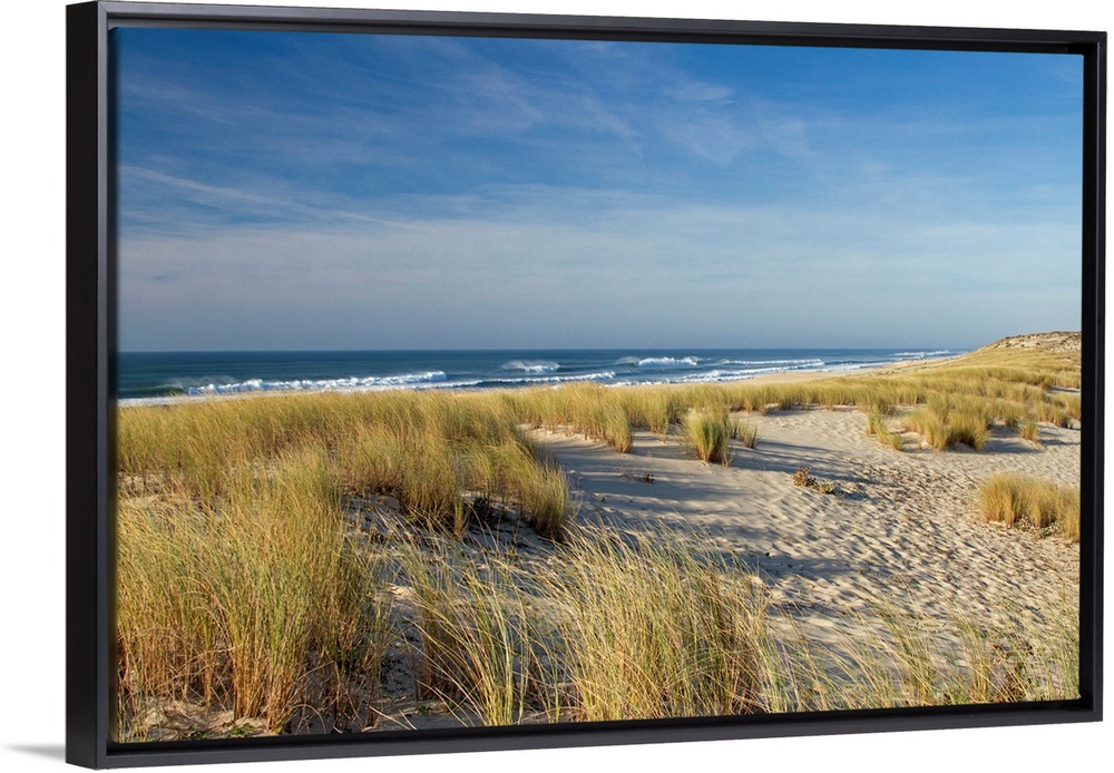 <p>Huge photograph taken from a shoreline of France displays streaks of high grass spread throughout a beach while waves of a sea crash into the shore.</p>