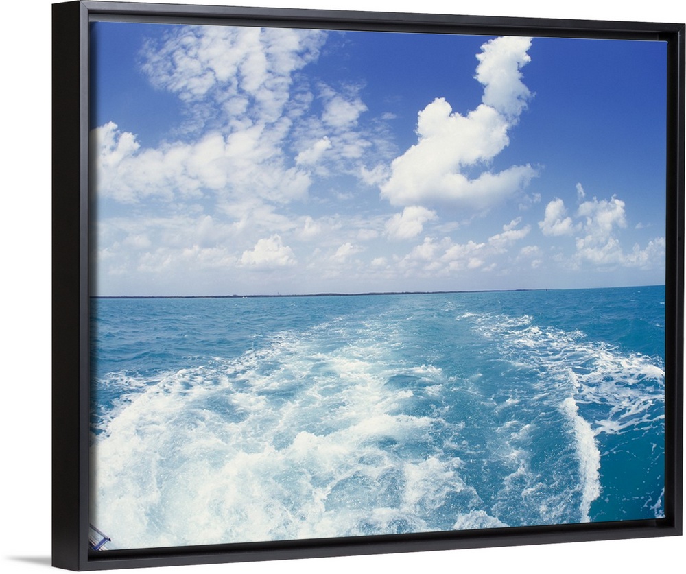 <p>Photo on canvas of the ocean with land in the far distance and puffy clouds above looking from behind a running boat.</p>