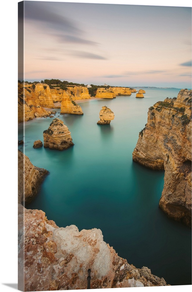 <p>Iconic rock formations and turquoise water of the Atlantic Ocean at Praia da Marinha along the Atlantic coast in Caramujeira, part of the Lagoa Municipality, at sunset, Algarve, Faro District, Portugal</p>