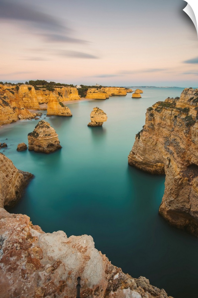 <p>Iconic rock formations and turquoise water of the Atlantic Ocean at Praia da Marinha along the Atlantic coast in Caramujeira, part of the Lagoa Municipality, at sunset, Algarve, Faro District, Portugal</p>