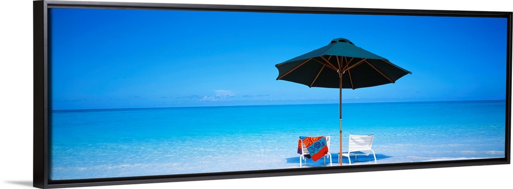 <p>Two beach chairs under an umbrella in front of the ocean in the sand on the Turks and Caicos Islands.</p>