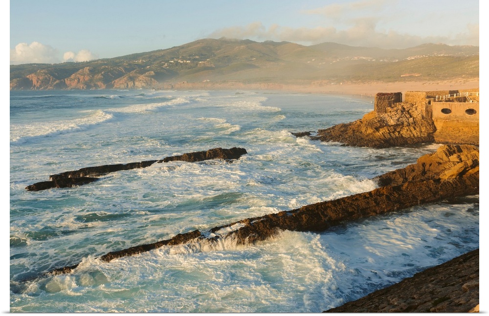<p>Atlantic Ocean waves along the shores of the Praia do Guincho near Cascais with the Estalagem Muchaox hotel's outdoor swimming pool built within the stone wall ruins of an old fort, Praia do Guincho, Cascais, Lison, Portugal</p>