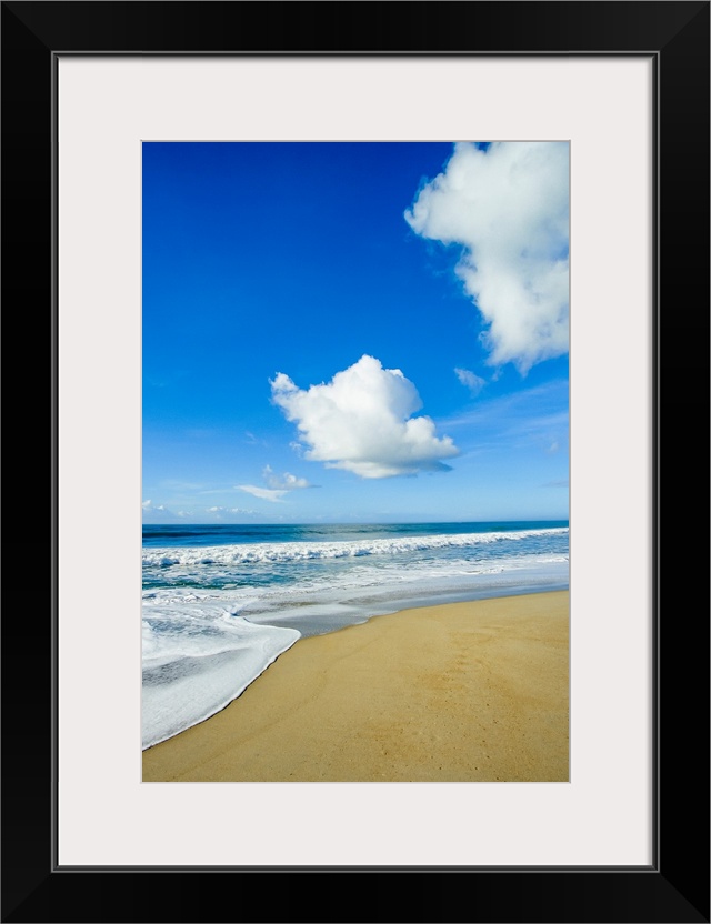 <p>Atlantic ocean waves break on the beach on a sunny day with clouds.</p>