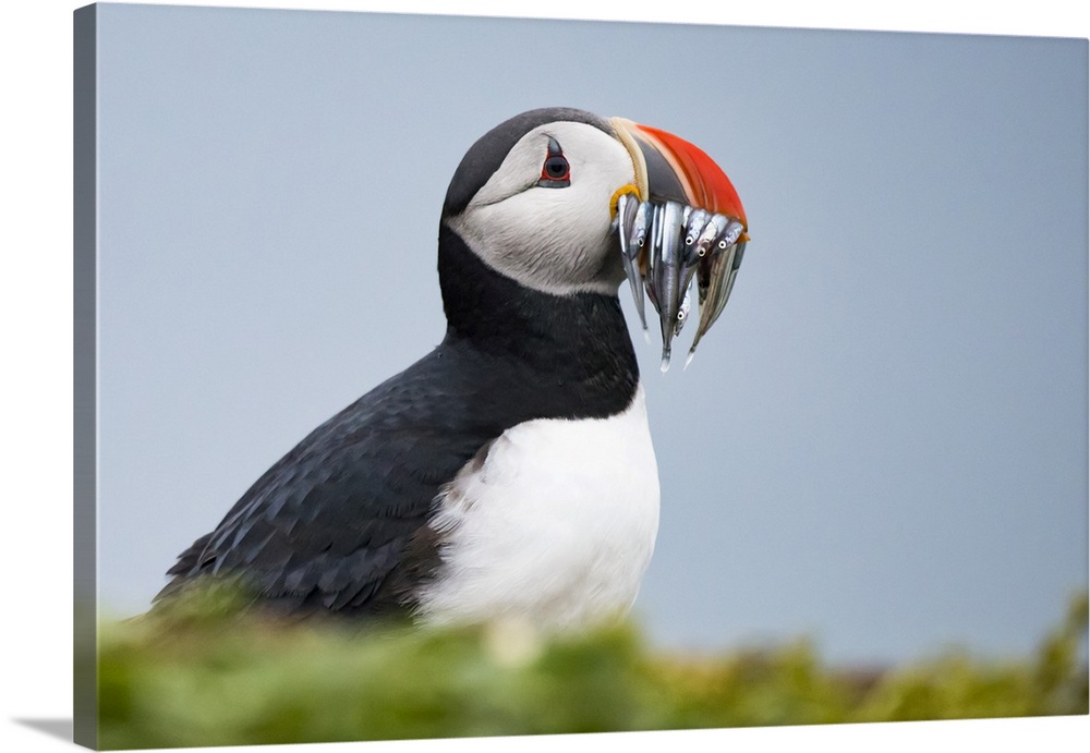 <p>Atlantic puffin carrying mouthful of spearing baitfish to feed its chicks, Iceland</p>