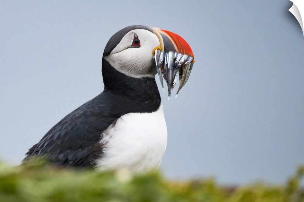 <p>Atlantic puffin carrying mouthful of spearing baitfish to feed its chicks, Iceland</p>