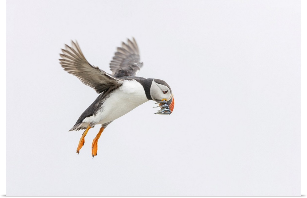 <p>Atlantic Puffin (Fratercula arctica) in flight carrying sandeels, Isle of May, Firth of Forth, Scotland, UK</p>