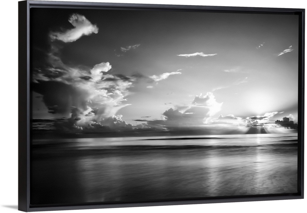 <p>A black and white photograph of a sunrise sky with clouds obscuring the view.</p>
