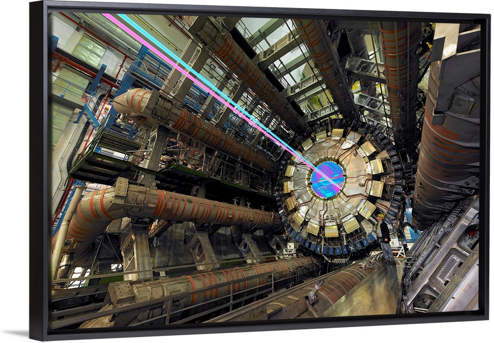 <p>ATLAS detector. Composite image of the ATLAS (a torodial LHC apparatus) detector (circular) at (the European particle physics laboratory) near Geneva, Switzerland. The detector will be placed around the large hadron collider (LHC), 's highest energy particle accelerator. A computer representation of the proton beams that will flow through the LHC has been added to the photograph. ATLAS is a general- purpose detector designed to measure the broadest possible range of particles and physical processes that could result from the collision of the proton beams at very high energies. A pilot run of the LHC is scheduled for summer 2007.</p>