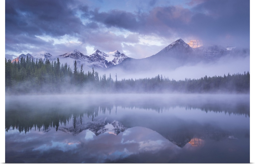 <p>Atmospheric misty sunrise in Banff National Park in the Canadian Rockies, Alberta, Canada, Autumn, September, 2016. Alberta, Canada.</p>