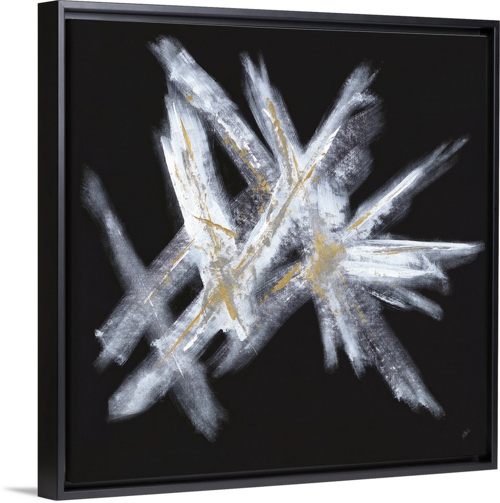 <p>Square abstract painting with a solid black background that has white crossing brushstrokes on top with small gold lines on top of those.</p>