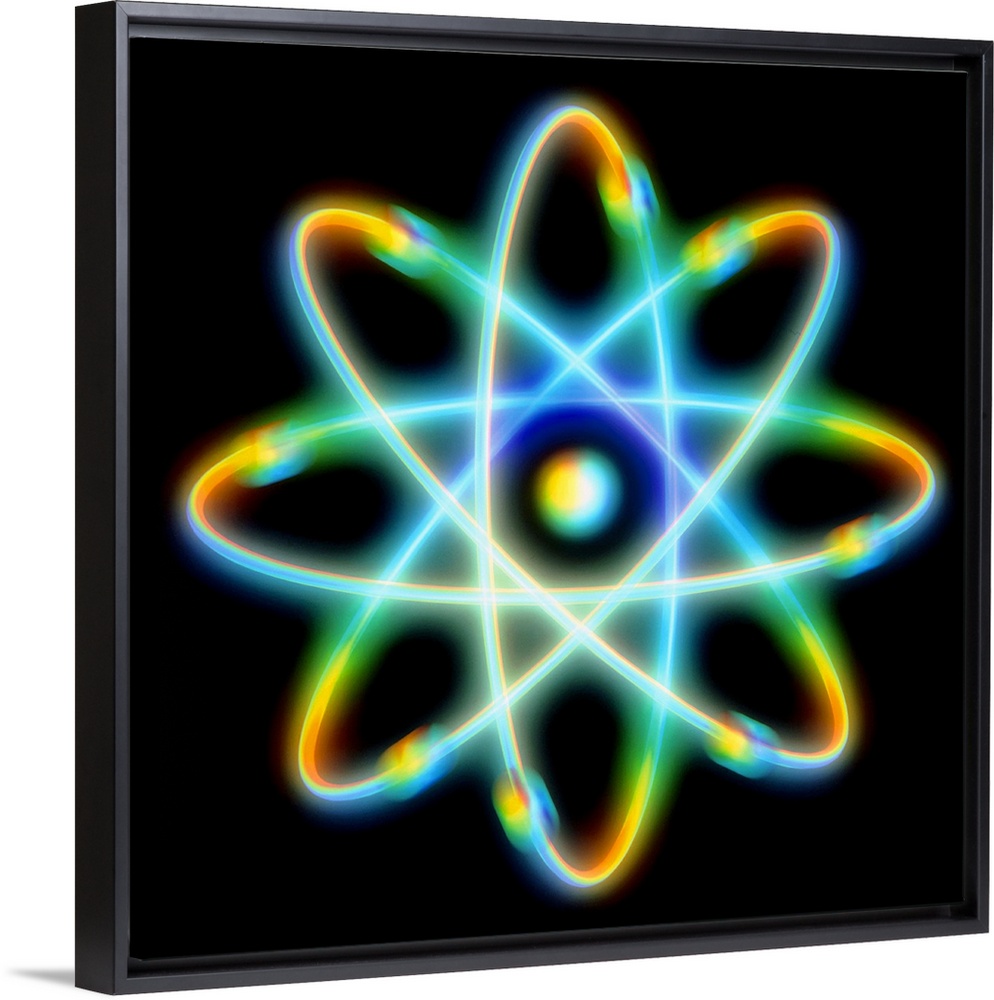 <p>Atomic structure. Conceptual computer artwork representing the structure of an atom. Eight electrons are seen orbiting the central nucleus along definite paths. This is a schematic \Bohr model\ of an atom; electrons are thought to inhabit areas of probability around a nucleus rather than fixed paths such as these.</p>