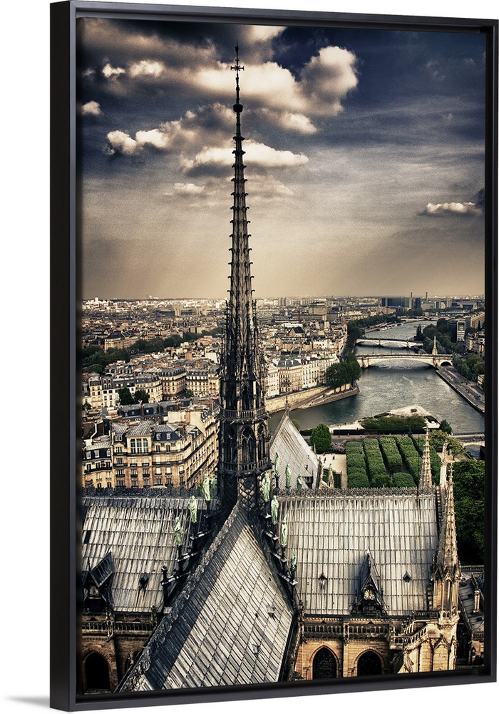 <p>Fine art photograph of the top spire of the cathedral, overlooking the Seine river and the Ile-de-Paris on a cloudy day.</p>