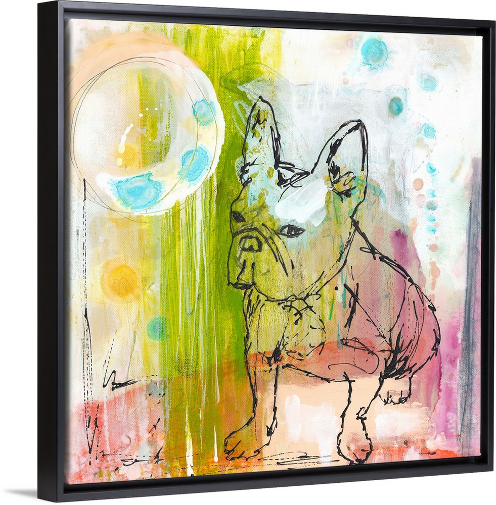 <p>A French Bulldog drawn on a colorful abstract background.</p>
