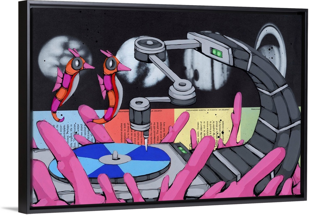 <p>Pop art painting of two seahorses floating towards a needle on a record player.</p>