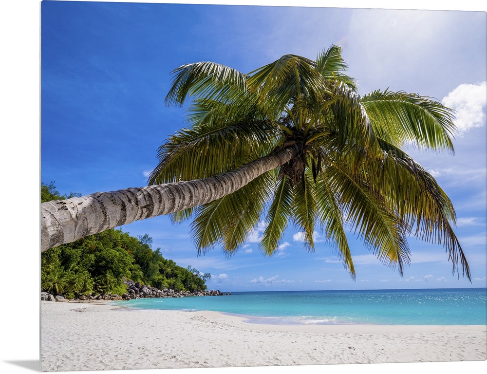 <p>A typical lonely palm tree on a large Seychelles beach.</p>
