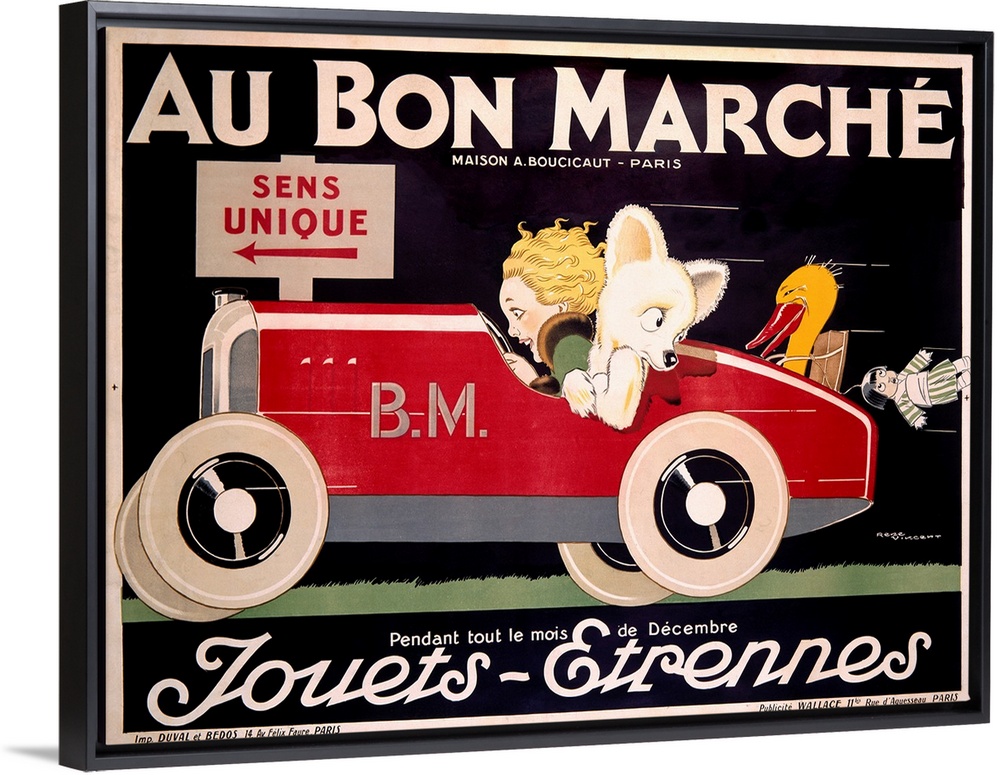 <p>Classic advertisement for the Au Bon Marche featuring a woman driving a car with an animal in the passenger seat with toys about to fall out of the trunk of the car.</p>