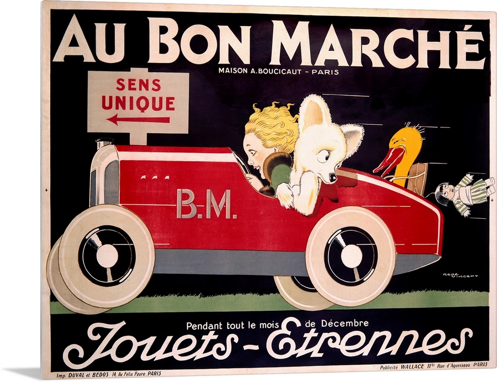 <p>Classic advertisement for the Au Bon Marche featuring a woman driving a car with an animal in the passenger seat with toys about to fall out of the trunk of the car.</p>
