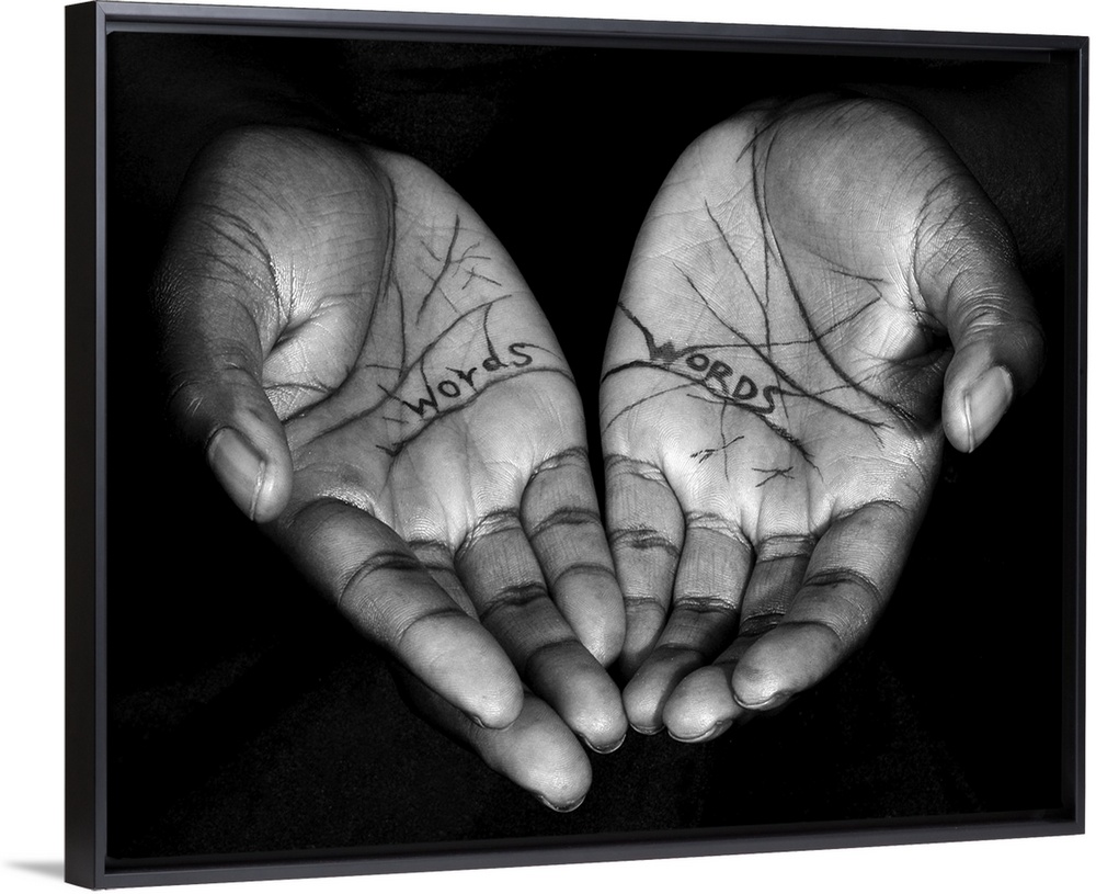 <p>A high impact contemporary black and white photograph of a pair of hands feadruing the words 'words' inscribed on them</p>