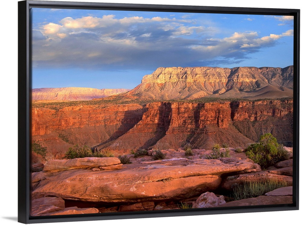 <p>Big landscape photograph of Aubrey Cliffs in the sunlight, beneath a cloudy blue sky, taken from Toroweap Overlook in the Grand Canyon National Park, in Arizona.</p>