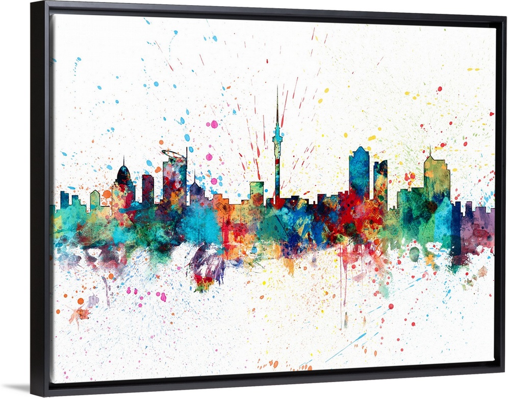 <p>paint splashes art print of the skyline of Auckland, New Zealand</p>