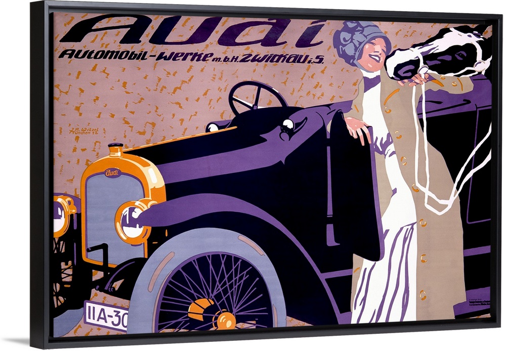 <p>Large, horizontal vintage advertisement for an Audi automobile, of a woman standing next to a car with an open door, while she acknowledges a horse that's peeking its head from the corner of the image.</p>
