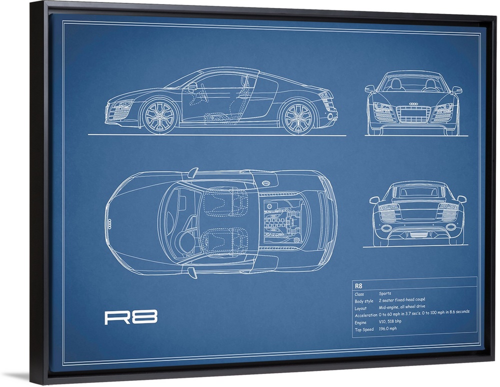 <p>Antique style blueprint diagram of an Audi R8 V10 printed on a Blue background.</p>