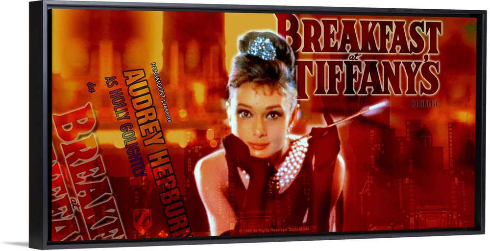 <p>A panoramic movie poster of Audrey Hepburn's famous pose in Breakfast at Tiffany's. There is a red hue to the image.</p>