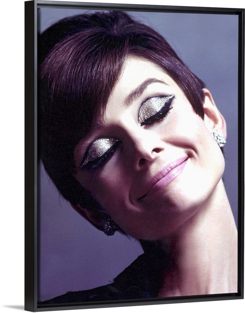 <p>Canvas photo art of Audrey Hepburn with sparkling eye make up smiling.</p>