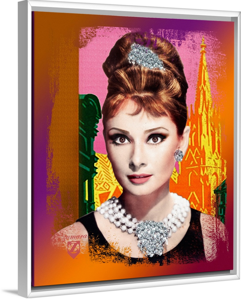 <p>Portrait artwork on a large wall hanging of a bust image of Audrey Hepburn wearing a large, jeweled hairpiece, earrings and necklace. Vibrant outlines of a city in the background, and she is surrounded by a multi-colored border with rough, sponge textured edges.</p>