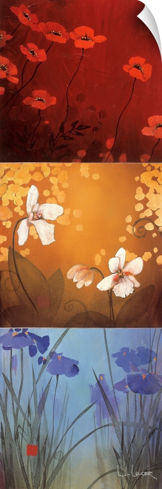 <p>A long vertical painting of flowers in three panels of red, yellow and blue.</p>