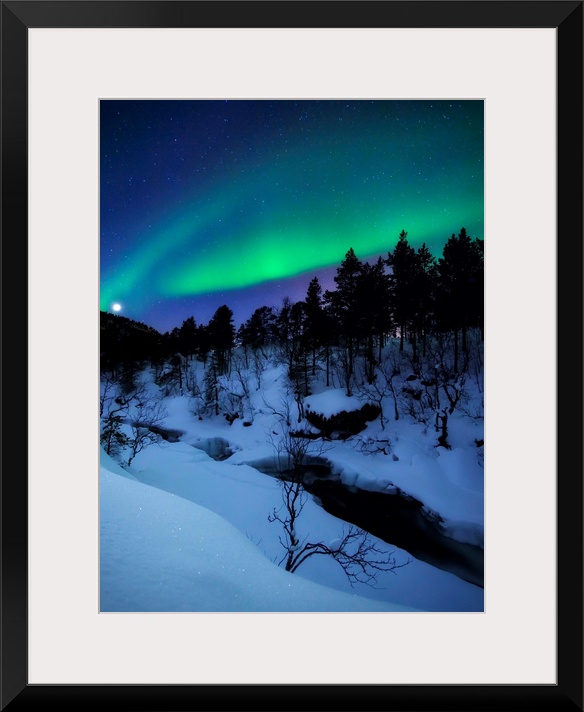 <p>Aurora and a Full Moon over Tennevik River, Troms County, Norway. Auroras are the result of the emissions of photons in the Earth's upper atmosphere.</p>