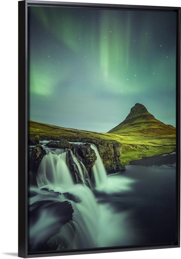 <p>Long exposure landscape with waterfalls and aurora borealis above Kirkjufell Mountain, Snaefellsnes peninsula, Western Iceland, Europe.</p>
