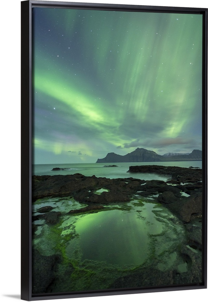 <p>Aurora Borealis above the island of Kalsoy, photographed from the coastline of Gjogv on the island of Eysturoy, Faroe Islands, Denmark, Europe. Spring (April) 2016.</p>