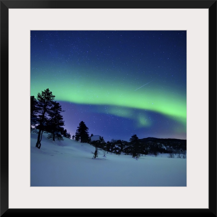 <p>Aurora Borealis and a shooting star in the woods of Troms County, Norway. Auroras are the result of the emissions of photons in the Earth's upper atmosphere.</p>